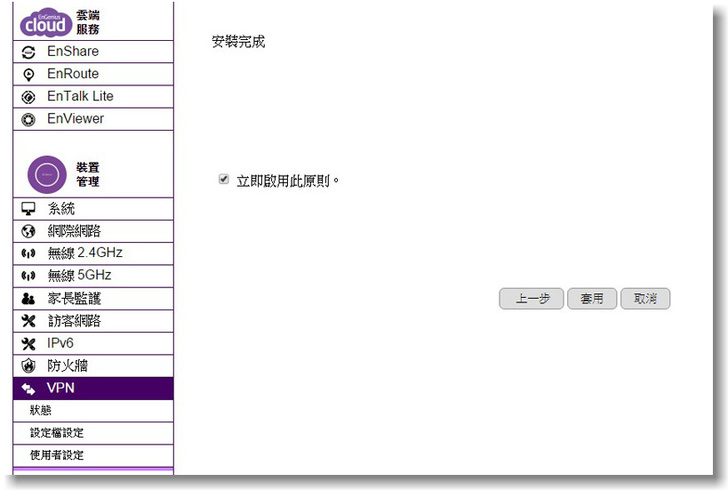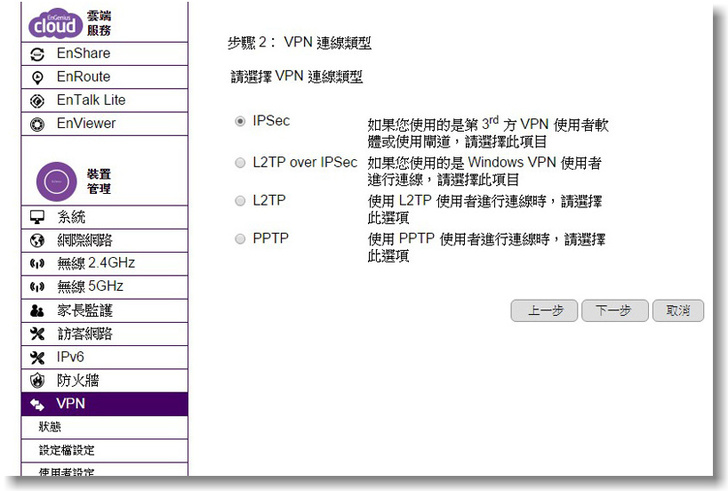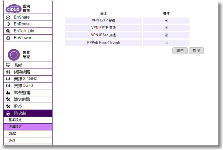 ▲因為EPG5000路由器支援 VPN 穿透,允許 VPN(虛擬私人網路)封包穿透防火牆。所以在『進階設定』中可以打勾啟用這些功能。
