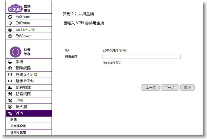 ▲最後設定VPN的金鑰,共用金鑰為 VPN 連線的密碼。 此原則設定的所有 VPN 成員的密碼都相同。
