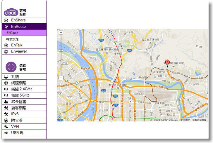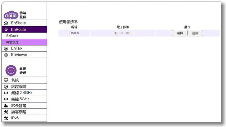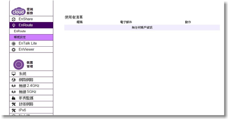 ▲『帳號設定』中,EnGenius EnRoute APP 可讓使用者將智慧型手機 APP 登錄至 EnGenius 智慧型雲端路由器。此路由器支援記錄使用者的位置與旅遊路徑,並將歷史記錄儲存於 EnGenius 智慧型雲端路由器內。路由器管理員可在此頁面管理 EnRoute 使用者帳戶。