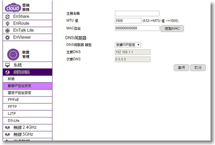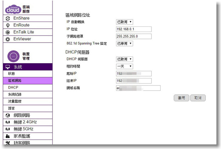 ▲接著是『區域網路』,本頁面可設定路由器 IP 、啟用 DHCP,對網路用戶端指派虛擬 IP 位址,以便共用網際網路連線。 或根據特殊需求變更 DNS 伺服器。