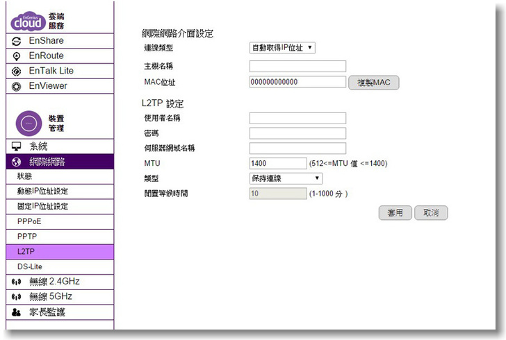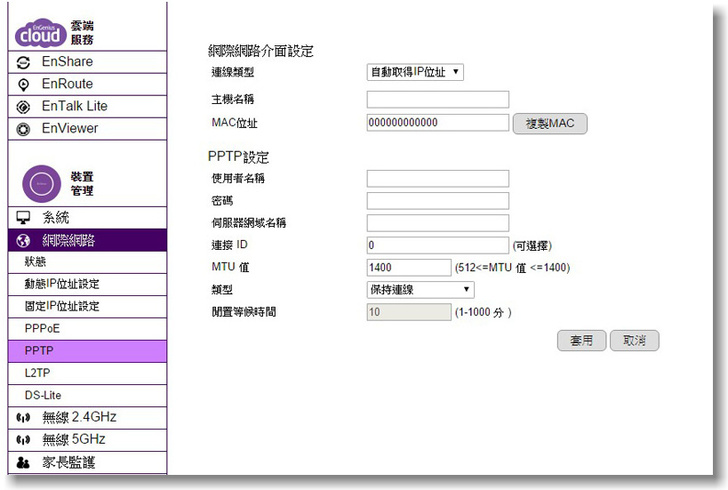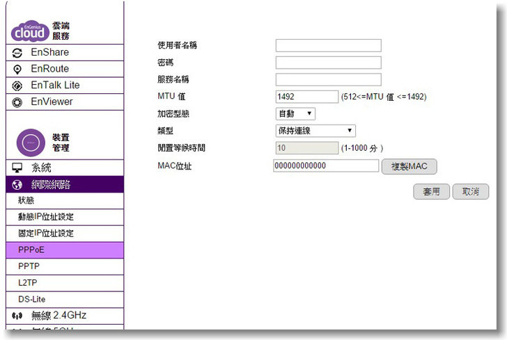 ▲『PPPoE』、『PPTP』、『L2TP』選項中,若是以其中的任一方式進行連網,就要在此設定網際網路服務提供商(ISP)所提供使用者名稱和密碼。