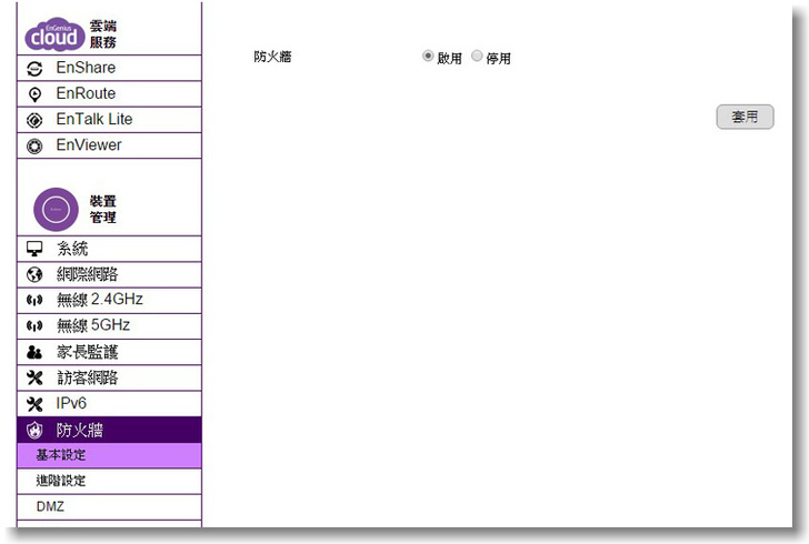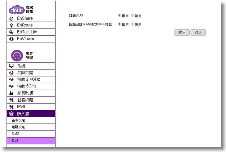 ▲「防火墻」可以在『基本設定』中啟用,啟用後可以自動偵測並封鎖 DoS (拒絕服務)攻擊。 也支援網址封鎖、封包過濾和 SPI(狀態封包檢測)
