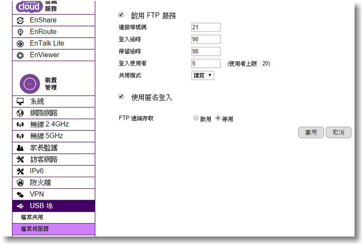 ▲『檔案伺服器』可利用 FTP 伺服器,共用 USB 儲存空間的檔案,並可設定是否能使用遠端存取功能。