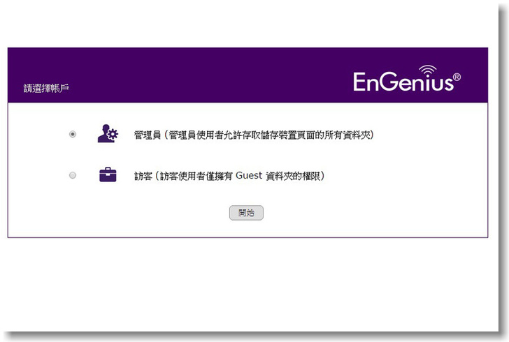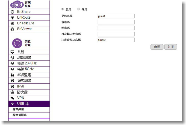 ▲『訪客帳戶』是用來區別 「管理員」 及 「訪客」 使用者。只有 「管理員」 使用者可以存取所有資料夾。 「訪客帳戶」 只能使用 USB 相關檔案共用功能。