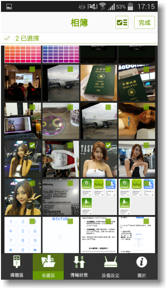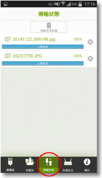 ▲我就開啟相簿選擇兩張照片來上傳,傳輸的詳細狀況可在第三個『傳輸狀態』中查看。