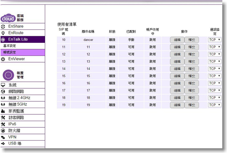 ▲『帳號設定』中能設定10組使用者清單,每一個人有一組SIP號碼