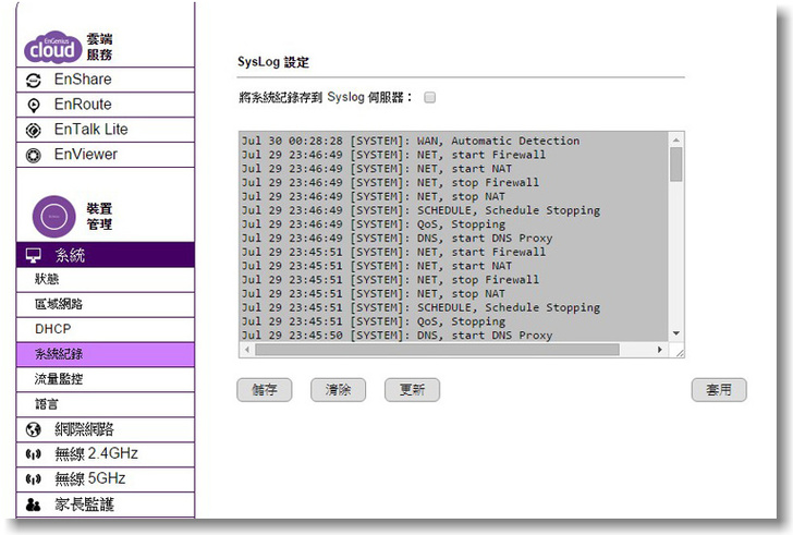 ▲『系統記錄』記錄著此路由器的所有相關重要系統訊息。主要用於追蹤系統操作和重要活動。該記錄儲存在記憶體中,並在需要時覆寫。 按一下 [儲存],即可將目前記錄儲存至檔案。