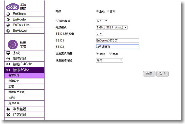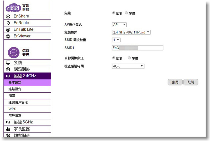 ▲在2.4GHz和5GHz的設定是相似的,就一併介紹。在『基本設定』中可以選擇是否開啟無線網路、以及 SSID名稱的設定、無線模式等等。
