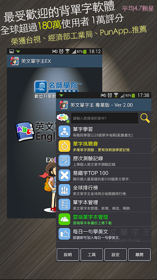 EngKing是一套【易學易用、沒有廣告】的 Android 背單字軟體,特色是可以很快的在手機上學習英文單字,主要提供單字學習、單字測驗、測驗記錄上傳、易錯字TOP 100、全球排行榜、單字本管理等六大功能。其中單字等級共分為初級、中級、中高級、全民英檢、TOEIC多益、職場必備300字、自訂等七大等級,未來將再加入TOEFL托福等更多單字。