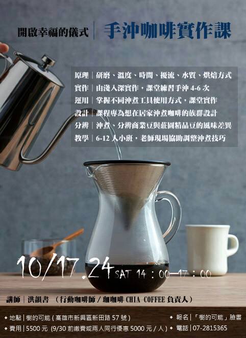 ^_^ 特別要說明的是,這門手沖課學員需要自備完整的手沖器具(請參考http://goo.gl/forms/JXC3H7qrIz),老師希望學員在課堂上操作時就可以同時了解自己使用的手沖器具特性,回家之後也能繼續練習、實際應用。