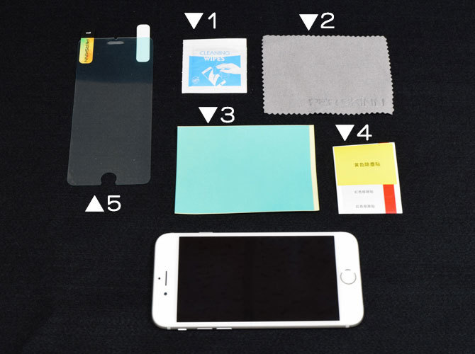 下面以PerSkinn亮面保護貼示範。首先拆開包裝,將保護貼和配件內容物,取出後平放於桌面上,依序擺放。