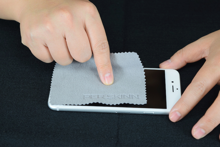 使用內附酒精綿片,清潔手機螢幕上的髒汙油漬,螢幕邊緣記得也要順便清理。