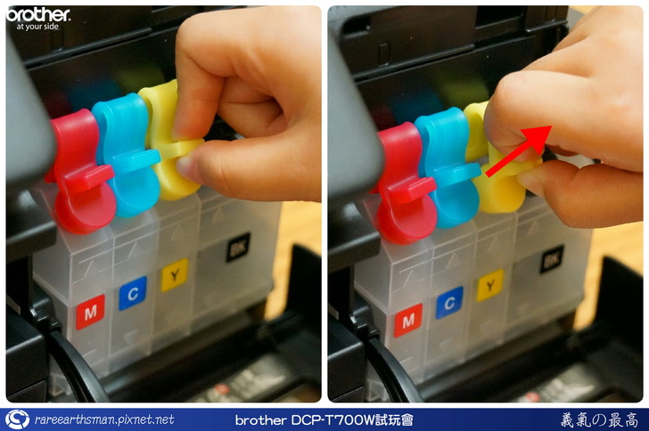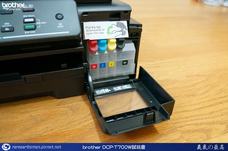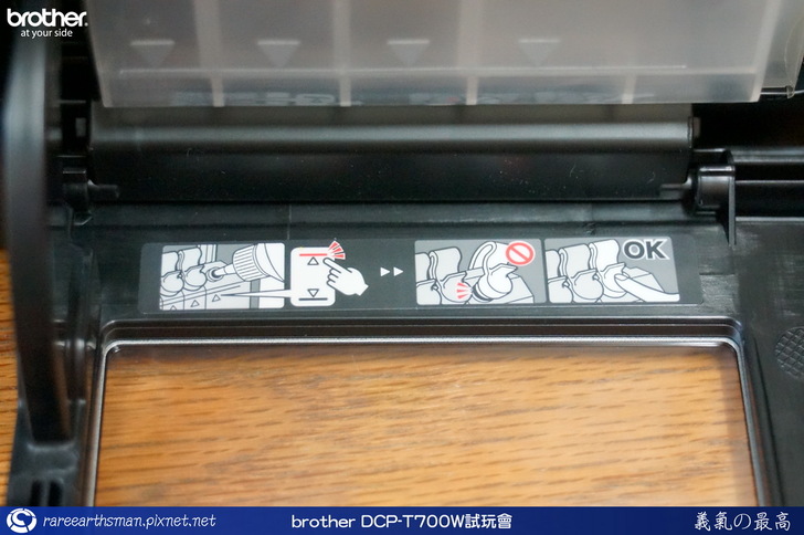 ▲DCP-T700W墨水槽蓋開啟後原廠放了張如何打開墨水夾帽的圖示。