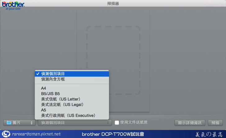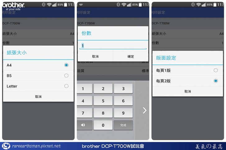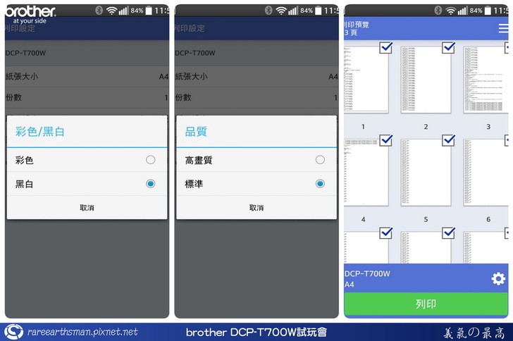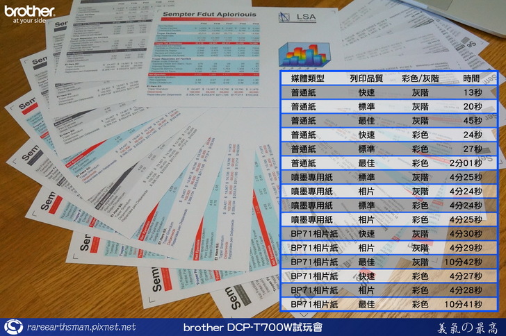 ▲brother軟體裡面有針對不同的紙張及列印品質做了一些設定,例如普通紙,噴墨專用紙及相片紙,在不同的列印品質下,在灰階與彩色的列印會造成不同的效果,也有不同的列印時間;而紙張部分我都是使用普通紙來做列印,只是軟體上選擇不同的紙質;當然列印的時間也只是僅供參考,不同的內容會影響列印的時間,如果是滿版的的圖片肯定會需要更多的時間來列印。