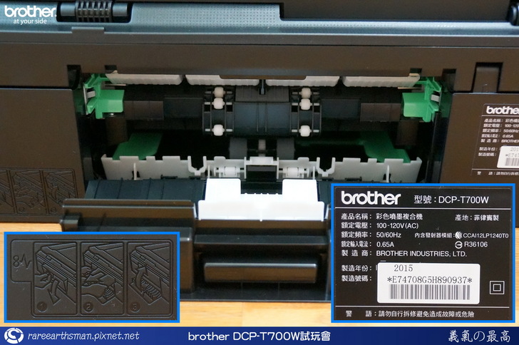 ▲DCP-T700W的背面是卡紙清除蓋,左下角有圖示引導如何清除卡紙,右側貼有T700W的電器規格貼紙。