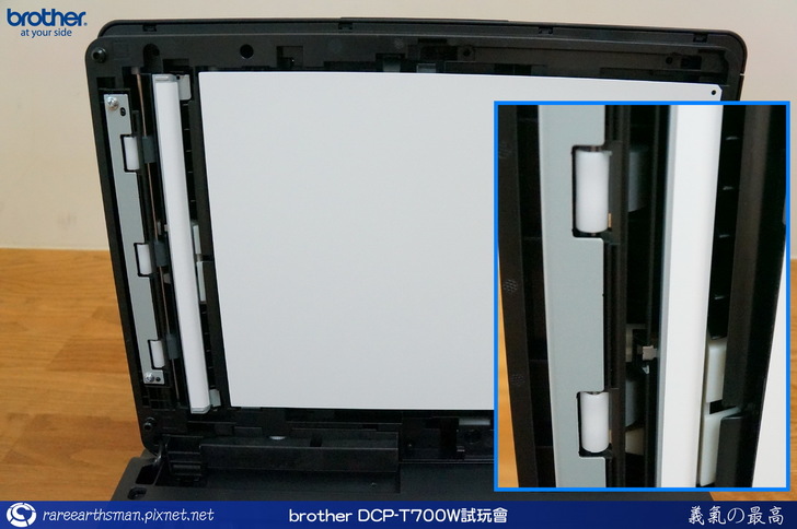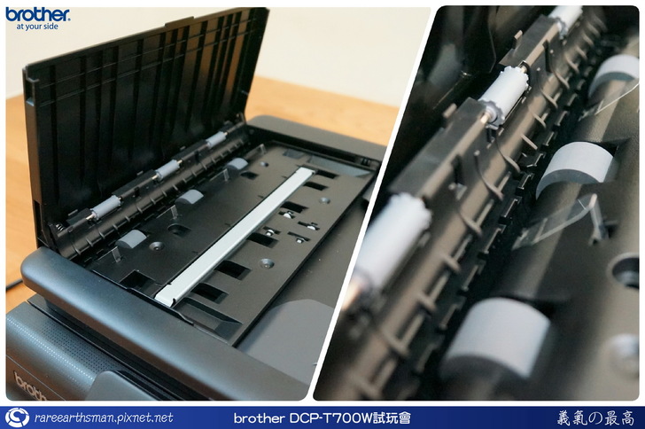 ▲DCP-T700W自動進稿機的滾輪機構,原稿要碰觸到滾輪,滾輪才可能將原稿送入進稿機中,當然蓋板打開也可以處理卡紙。