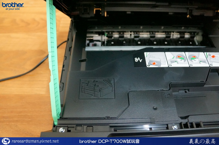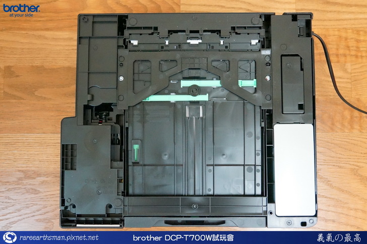 ▲DCP-T700W的底部在紙匣抽出後就可以看件內部結構,包括列印頭的另一面,圖中列印頭兩側淺綠色的塑膠結構就是在排除卡紙前要先扳開的機構。