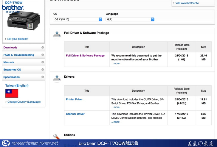 ▲在brother的網站裡可以下載DCP-T700W相關的軟體與說明書,T700W在系統端可以支援Windows、OS,Linus、Mobile。