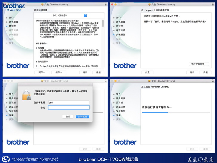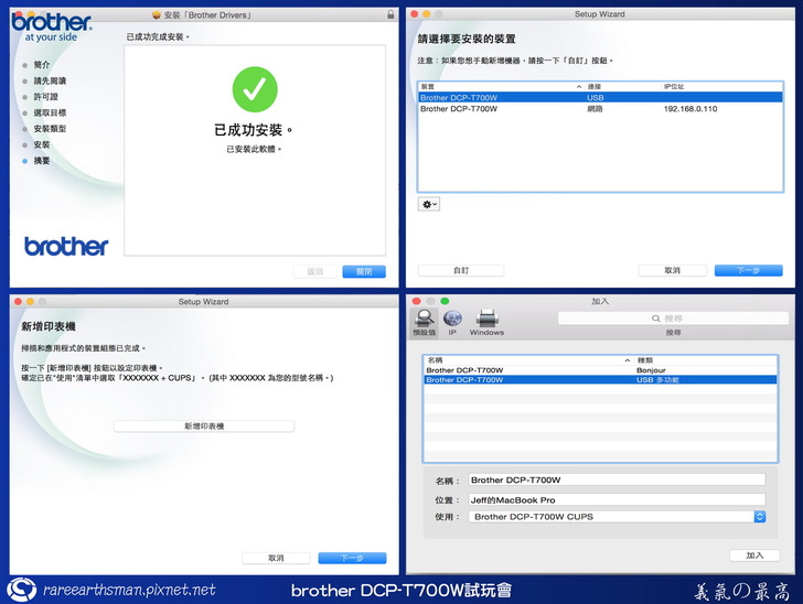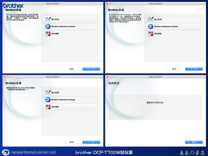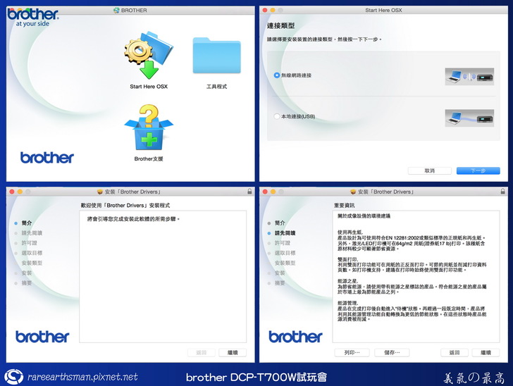 ▲在OS系統裡的安裝狀況,在安裝T700W軟體時可以選擇使用無線網路連接或是USB連接,接著Brother Drivers就會一步步引導使用者來安裝。