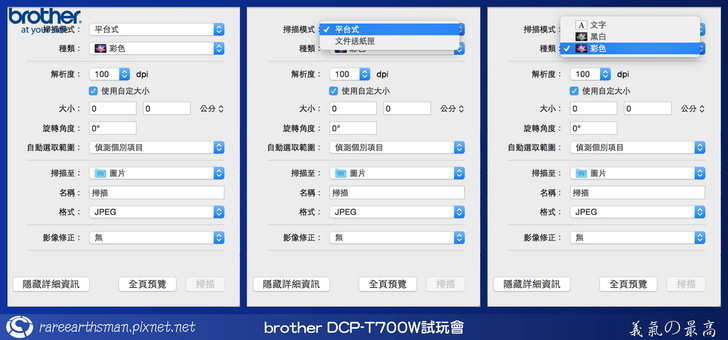 ▲掃描器的功能設定,包括掃描模式除了可以使用平台式或文件送紙匣外,種類也可以選擇文字、黑白與彩色。