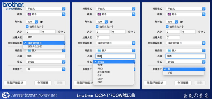 ▲掃描器的功能設定,自動選取範圍可以選擇偵測個別項目與偵測內含方框,格式可以選擇jpeg、tiff、png、jpeg2000、gif、bmp、pdf。