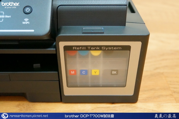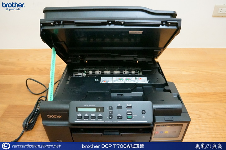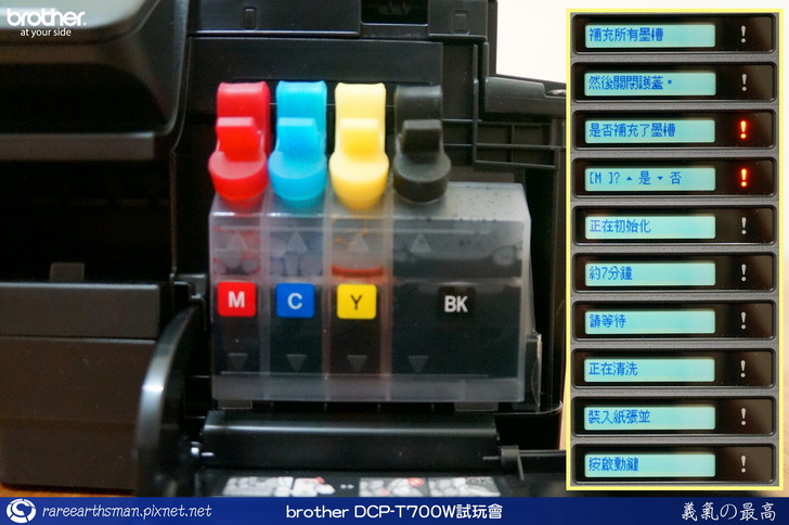 ▲DCP-T700W墨水槽補充完畢的情形;原廠要求補充墨水匣要在電源開啟的狀況下處理,因為拿來體驗時墨水槽是空的,所以一接上電源後T700W的LCD螢幕就顯示補充墨槽;補充玩墨水匣後就開始了大概7分鐘初始化的步驟,之後是顯示裝入紙張,之後就可以正常使用了。