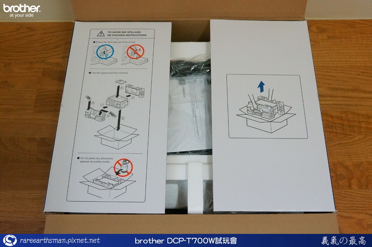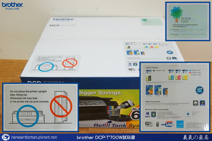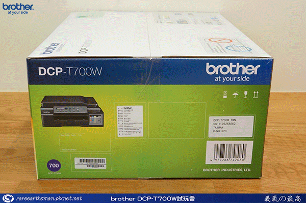 ▲外箱的上面印刷著一些T700W的圖像文字規格、擺放方式與Brother Earth的環保標誌。