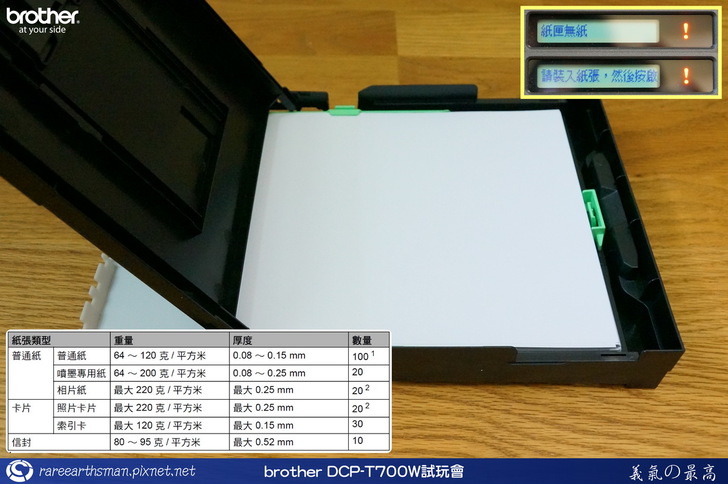 ▲DCP-T700W的紙匣可以裝入的紙張張數表,像我使用的A4普通紙就可以裝100張,實際上大概可以裝到105張,當然還是跟紙張厚度有關,不同的紙張材質可以裝入的數量也都不相同。如果紙匣沒紙的時候液晶螢幕也會顯示,驚嘆號也會閃橘燈。