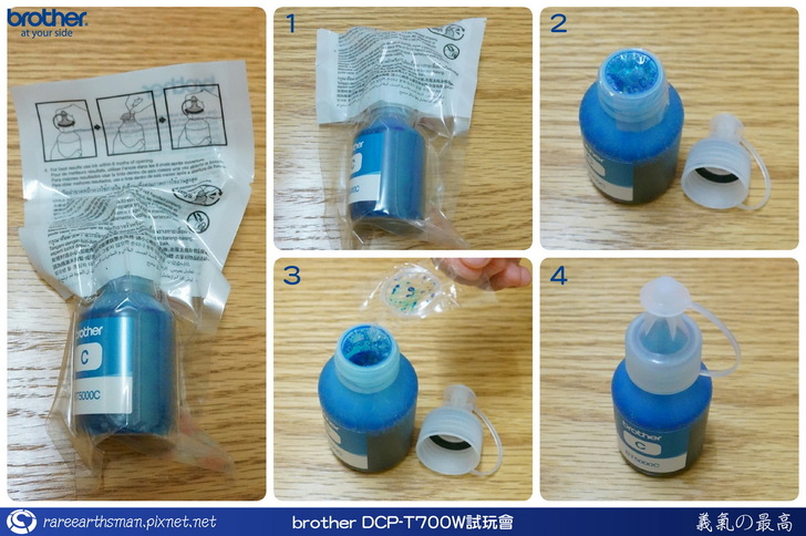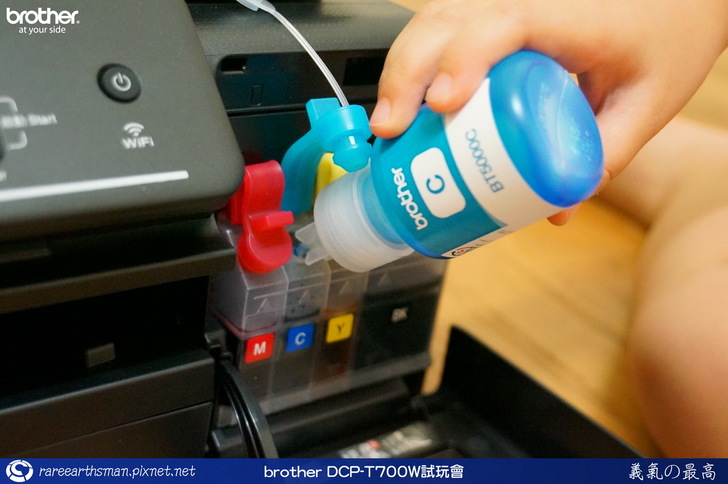 ▲DCP-T700W墨水補充特別強調的是瓶身是以45度角補充,跟一般90度墨水補充來比較,45度角比較不會將墨水外溢出來,本人在補充墨水時也都沒有被沾到;但是有個建議就是墨水瓶帽的部分建議可以長一點,前方的瓶嘴也可以長一點會比較好,我認為現在的瓶嘴可能太短了,手可能晃動的大一點,瓶嘴就可能晃到移出墨水槽口;再加上其實要將墨水瓶裏的墨水流入墨水槽基本上手要出力擠壓墨水瓶,將裏面的墨水擠出來,同時會發生墨水瓶裏會有許多的泡泡,其實還滿不容易看清楚到底墨水瓶裏的墨水是不是全部都流出來了,如果瓶帽部分長一點,會比較容易看清楚的。