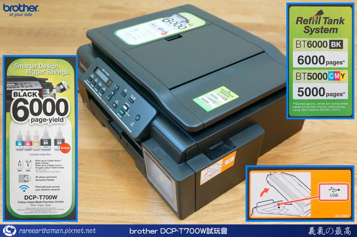 ▲DCP-T700W周遭貼了一些貼紙,其實就跟外箱的貼紙類似都是強調這台的功能,特別是墨水列印的容量部分,另外在T700W右側有貼著如何連接USB孔的指示貼紙。
