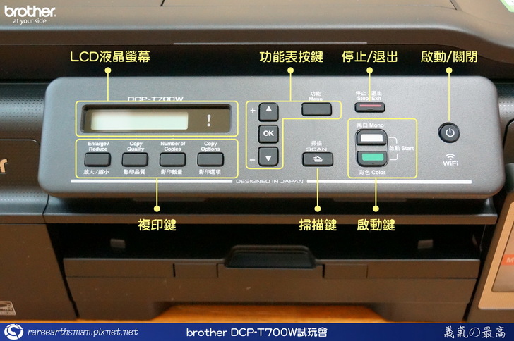 ▲這台DCP-T700W給我的第一印象是"還滿小台的",尺寸是435*374*180mm,重量只有8.3Kg,對於男性來說是很容易搬動的尺寸與重量,而且尺寸小也比較容易與書房或辦公室做搭配,只要有小小空間就擁有一個列印的空間。造型上我是不覺得有特別的感覺,基本上有滿多產品語意跟造型相結合的地方,例如操控面板就特別設計一個造型,使用者就會特別注意到這個區域上;又或者右邊的墨水盒封蓋前端設計成透明的,就很容易從外面看清楚墨水盒中的墨水存量;這些造型上的設計我只能說滿有巧思的,功能上的設計比較重,偏向實用性來設計,就造型設計評分大概可以得個8分吧。