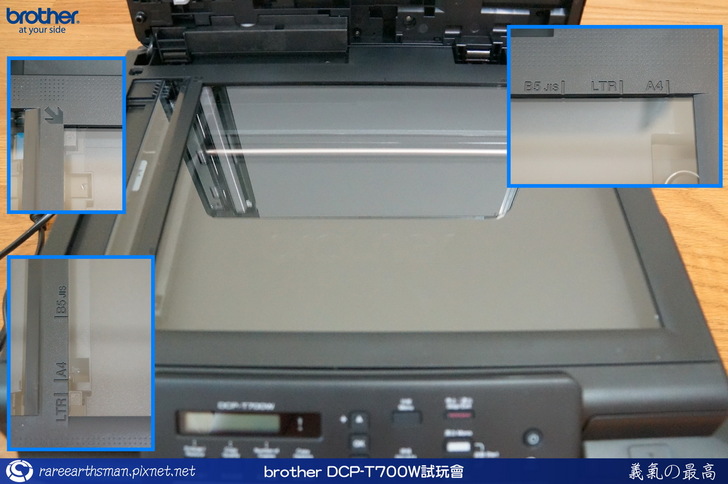 ▲DCP-T700W掃描器玻璃平台,平台一樣是以左上角為對齊原點,右上角及左下角分別都有不同尺寸的標示,像A4/LTR/B5。