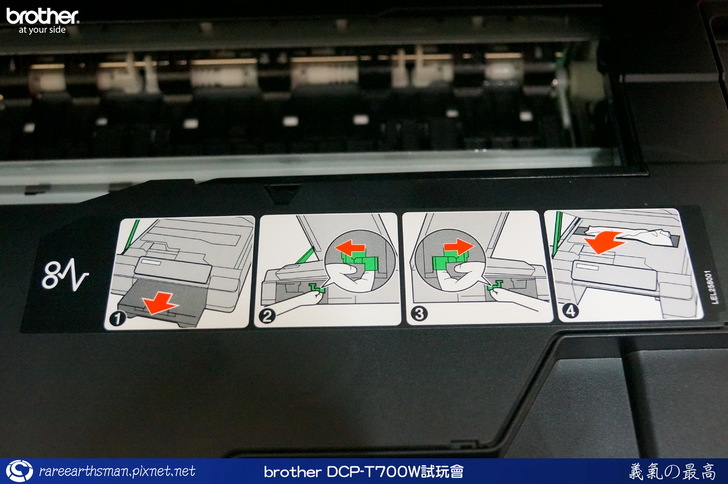 ▲DCP-T700W的掃描器頂蓋開啟也可以處理卡紙的問題,這裏也有如何排除卡紙的指示貼紙。
