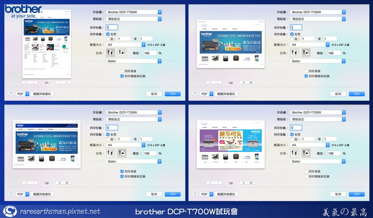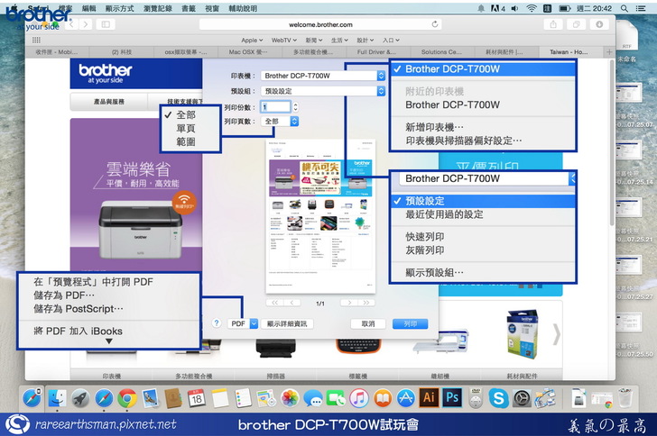▲Brother列表機在網頁列印上的選項,包括列表機的選擇,預設組,列印頁數及pdf。