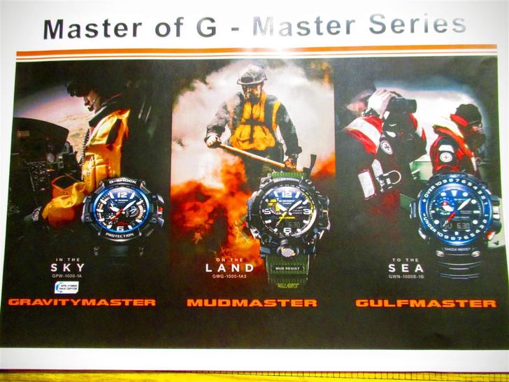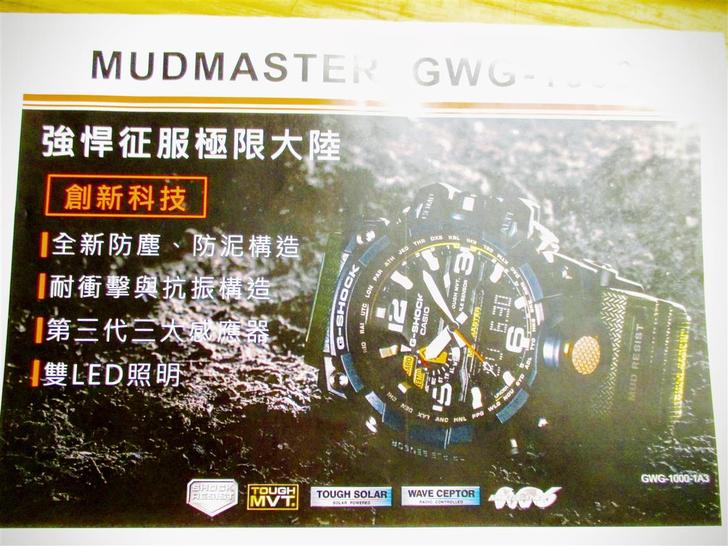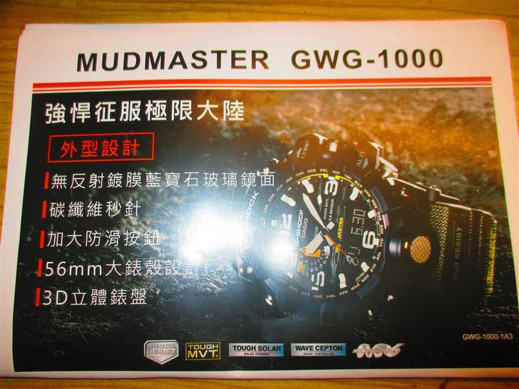 該GWG-1000的設計可承受惡劣的環境,如沙漠或泥漿。 它具有保護鍵結構像Rangeman。 除泥性的腕錶也能抵禦劇烈震動。 像Rangeman,該Mudmaster採用了三重傳感器,羅盤方位,高度計/氣壓計和溫度計。 它也有艱難的太陽能充電和多波段6無線電時間同步與標準的衝擊和耐水性(200米)。 其他規格包括耐低溫至-10℃或14°F,世界時間(29個城市,夏令時開/關),秒錶(24小時模式:經過時間,中途時間,第1和第2名次),倒數計時器(最長60分鐘),5種,每小時的時間信號,自動日曆和LED背光源。 手錶測量59.5×56.1×18.0毫米,重約100克。 圖為是GWG-1000-1A3。