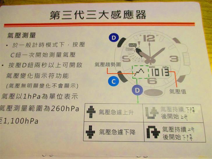 指針指向的就是「飛航模式」,「ST」代表碼錶功能、「TR」代表倒數計時功能、「AL」代表的是鬧鈴功能「AUTO」、「STD」、「DST」分別代表的是自動偵測、標準時間與夏令時間。當GPW-1000在接收GPS訊號時小指針會在半顆地球上指向當前的緯度 除了星期顯示之外也可以顯示當年日期,且內建萬年曆功能。
