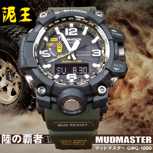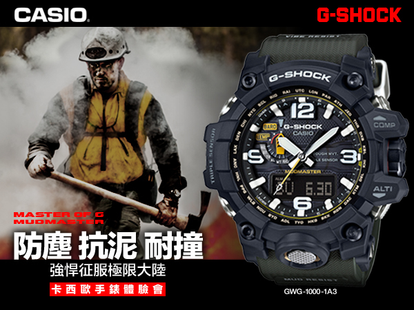 為強悍而生的CASIO G-SHOCK全面征服世界,以陸、海、空三大主軸打造出MASTER OF G系列,並於2015年9月推出全新強悍機能系列MUDMASTER GWG-1000,以”極限大陸”為開發概念,專為對抗險峻顛簸的極限陸上環境所設計。首支以全新防泥構造打造並搭載第三代三大感應器,不僅在塵土飛揚的沙漠或身陷泥濘的大雨中能順利操作各項功能,更精準掌握方位、高度/氣壓與溫度三大指標,全面提升探險家在嚴峻環境下資訊讀取的準確與便利性。錶帶以舒適防水的橡膠材質打造,仿帆布錶帶刻紋設計更為冒險家增添時尚帥氣風格,全系列共有三種選擇:強悍酷黑、軍事墨綠及搶眼黑黃,讓探險家不畏各種陸上極限環境,一展強悍本質,徹底展現刁悍魅力!