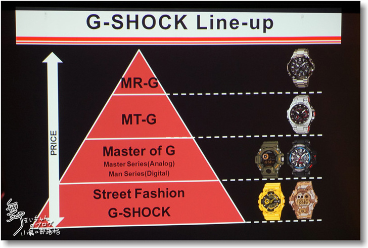 ▲首先先從G-SHOCK系列說起;PM以價格來區分,把G-SHOCK分為四類,最下方是走街頭流行的Street Fashion G-SHOCK系列;再來是以指針顯示為主的Master Series(Analog)系列和數字顯示為主的Master Series(Digital)系列;再往上是全金屬G-SHOCK是MT-G系列,這當初是為了飛行員所開發的錶款,所以俱備抗3G的功能;最後是G-SHOCK最頂級的MR-G錶款,以在只在日本限量販售,如今也在7月於台灣推出最新的MRG-G1000系列。