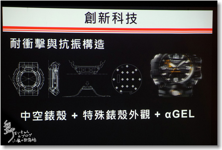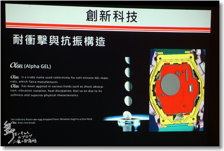 ▲ 而『耐衝擊與抗震構造』,首先《耐衝擊》一直是G-SHOCK非常強調的項目,這是錶殼錶帶是採用橡膠材質外,另外採用中空的錶殼,讓機芯與錶殼接觸面積減少,再利用特殊錶殼外觀去減少受到的衝擊力;另外《抗震》採用了一個全新的材質“αGEL”,這是一種膠狀的化合物,這最大的優點就是可以吸收衝擊力,另外就是絕佳的隔震效果。