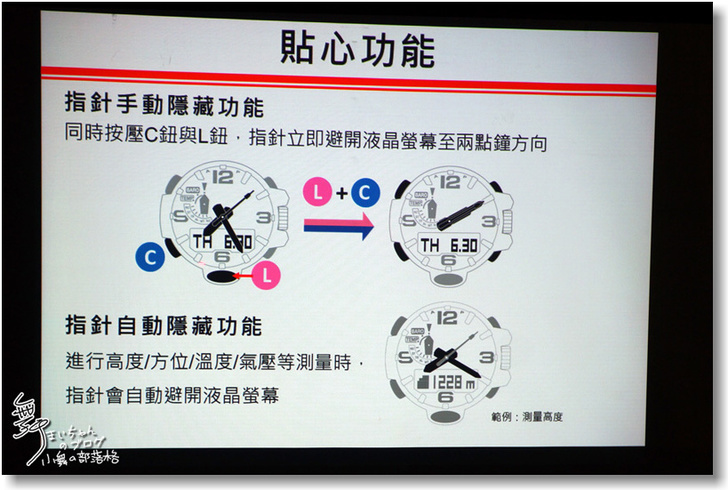 ▲接著GWG-1000還有一些貼心小功能,首先是『指針手動隱藏功能』,如果同時按下C鈕與冷光鈕,指針會全部避開走到2點鐘的方向,讓閱讀液晶螢幕不會被指針擋住。而如果剛好在進行剛提到那些高度/方位/溫度/氣壓等測量時,指針會自動滑向4點鐘和8點鐘方向,讓使用者可以輕鬆的閱讀螢幕上資訊。