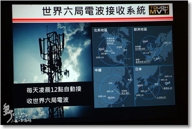 ▲而這裡也更詳細的說明CASIO獨創的機芯【Tough Movement】,包含有四大功能,其最大的功能就是《世界六局的電波接收系統 MULTI BAND 6》,配合中國電波塔的成立,CASIO支援全世界6所標準時間電波塔的訊號,一座在北美,及歐洲的英國跟德國,中國一座以及日本兩座,這些電波塔會穩定的發出低頻的電波,而手錶裡面有一根天線,它會每天凌晨12點接收電波去自動校正時間。