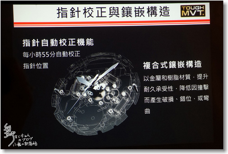 ▲還有《指針自動校正機能》,這是CASIO獨創的運算機能,在每小時55分0秒時會自動檢測和手錶內IC的時刻、指針等位置是否相符,只要偏差就會自動立即修正。接著是《複合式鑲嵌構造》,透過金屬和樹脂混合材質,包覆構成各零件素材,這樣可以整合兩者的優點,降低因撞擊造成的損壞,影響時間的準確度。