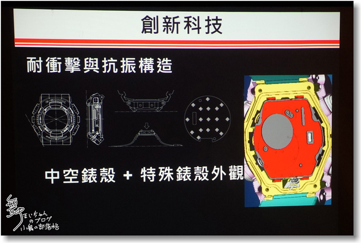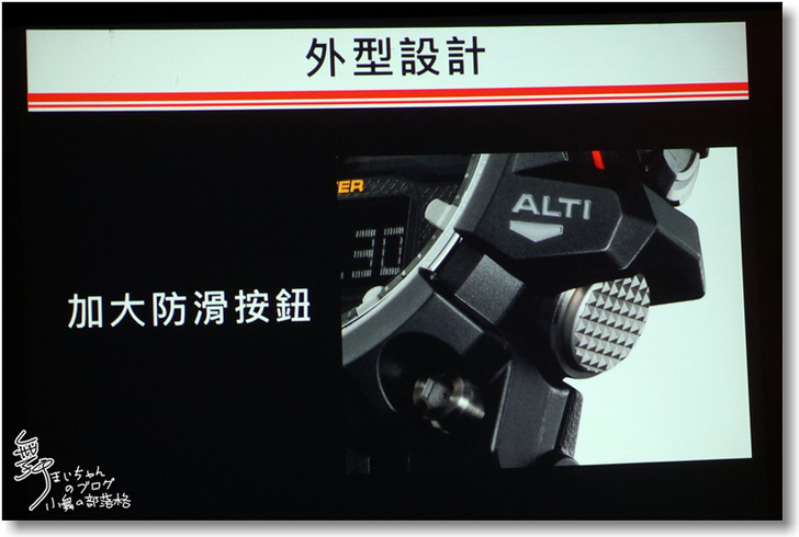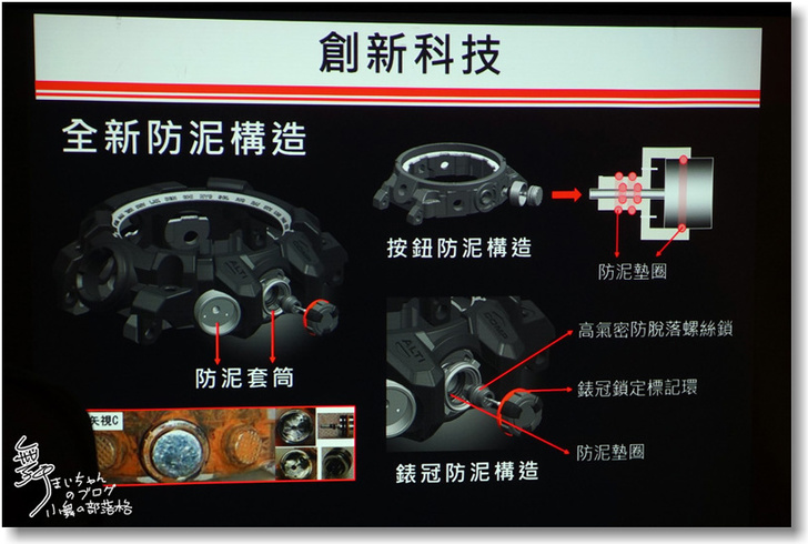 ▲這時PM開始逐一介紹這些功能。首先是『全新防泥構造』,最大的差異就是《防泥套筒》部份,在按鈕之下與錶殼的接合處完美結合,增加氣密性讓泥沙無法進入。而按鈕上也加了一層《防泥墊圈》,讓按鈕與套筒間無空隙。而錶冠會先有一個《高氣密防脫落螺絲鎖》,加上內部的《防泥墊圈》,增加氣密度。而貼心在錶冠處加了一個《紅色鎖定標記環》,要鎖到看不到紅色才算是鎖緊,確保防泥防塵功能。
