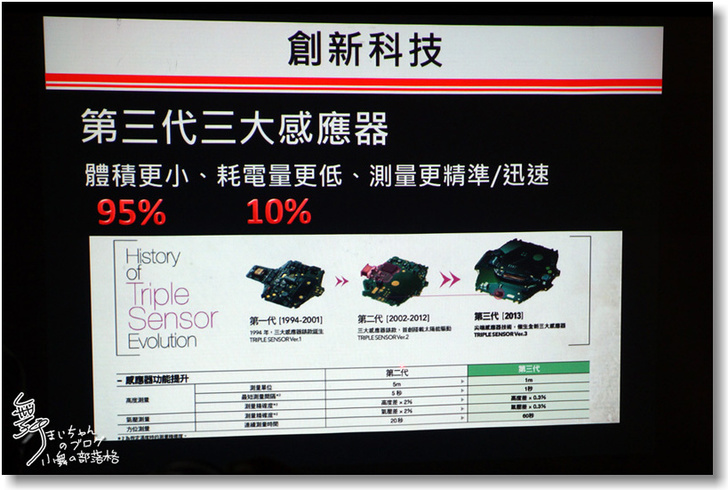 □『第三代三大感應器』:去年發表的第三代感應器,能夠測量測量高度(氣壓)、方位、溫度。