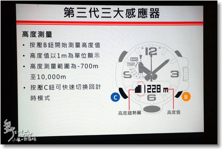 ▲接著是『高度測量』,其實是測量氣壓值去轉換高度,國際上有一個大氣壓力去換算高度的一個公式,藉由這個公式去換算。高度測量時只要按壓右下角的B鈕,液晶螢幕會顯示出ALTI的字樣,就會顯示出高度值;測量以1m為單位,高度測量範圍為-700m一直到10,000m。而螢幕左邊會有一個《高度趨勢圖》,橫軸是時間,緃軸是每格代表1公尺,所以共計有6格會顯示前6次的高度值,來判斷持續測量的高度差變化。