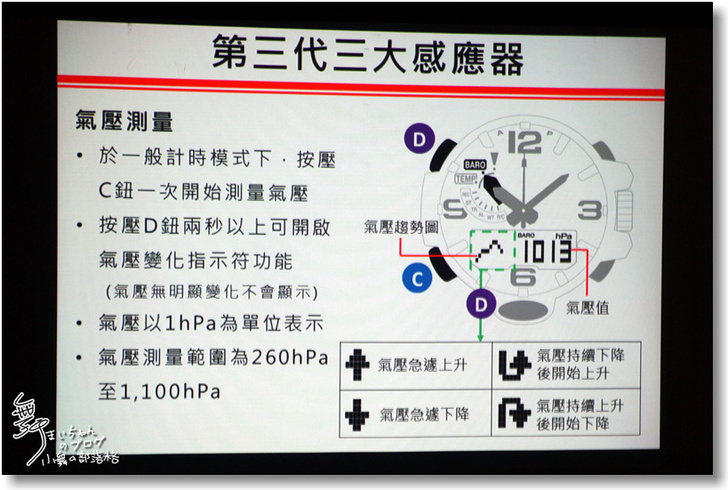 ▲下一個感應器是『氣壓測量』,這是在一般計時模式之下按壓C鈕進入氣壓測量模式,這時10點鐘方向的功能指針會轉向BARO,測量完就會顯示氣壓值。這也配有一個《氣壓趨勢圖》,GWG-1000會每兩小時自動測量氣壓一次,橫軸代表每次測量結果,緃軸每格代表100hPa,《氣壓趨勢圖》可以表示連續自動測量的氣壓趨勢,若氣壓值在上升可能代表天氣正在好轉,當氣壓值往下可能表示天氣逐漸變壞。另外還有一個氣壓值的警示系統,按下D鈕2秒以上,液晶螢幕會顯示INFO ON,開啟後變成每2分鐘自動測一次氣壓,若氣壓忽然急劇變化,就會發出警示,並出現如格中的圖示。氣壓測量的範圍以1hPa為單位,範圍從260hPa至1,100hPa。