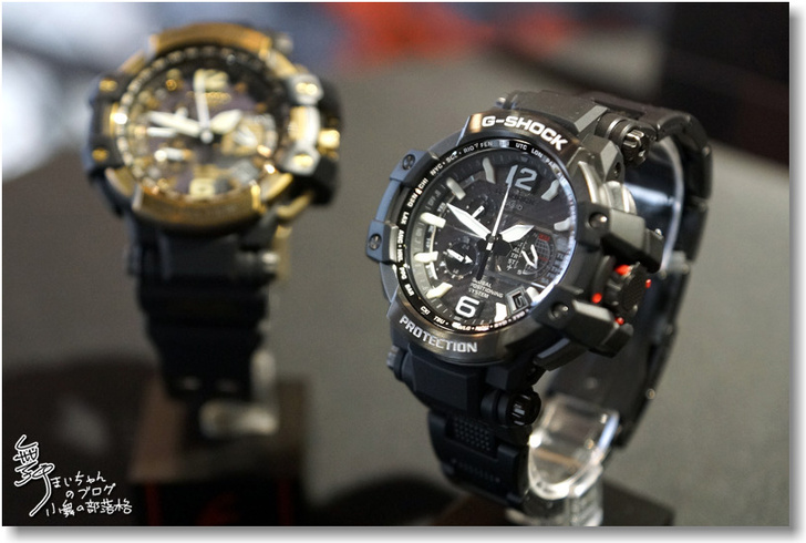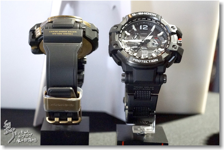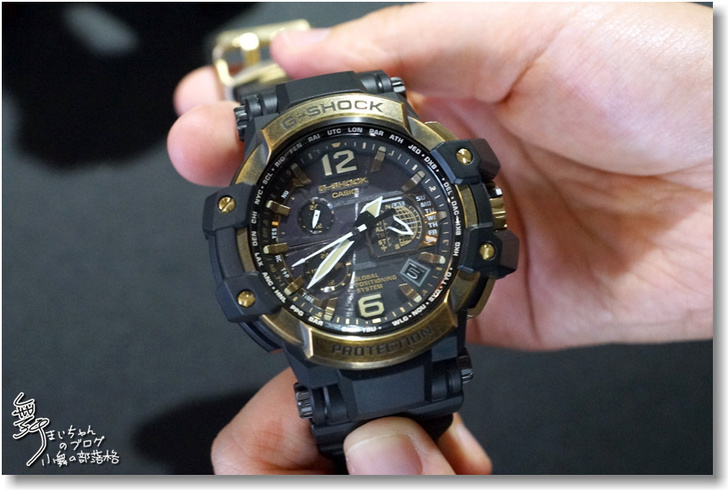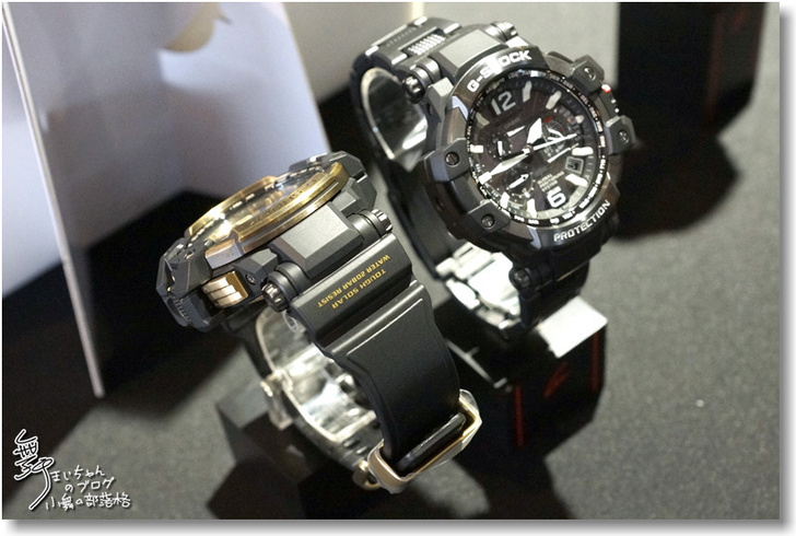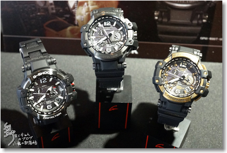 ▲現場展示GPW-1000系列的其中三款,分別是強化橡膠錶框的GPW-1000FC-1A、Ti64鈦合金酷黑GPW-1000T-1A和Ti64 鈦合金錶圈+金色IP處理的GPW-1000TBS-1A