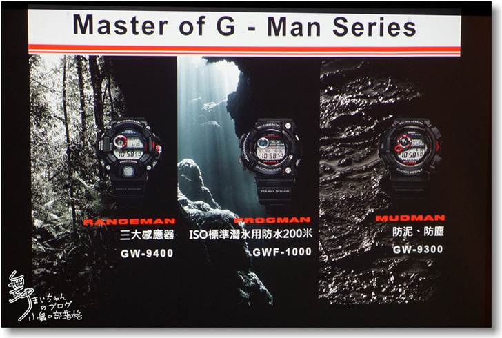 ▲而另外Man Series是以數字顯示方式為主,目前主推的三個錶款分別是RANGEMAN的GW-9400,俱備三大感應器;FROGMAN的GWF-1000,這也是G-SHOCK中唯一通過ISO標準潛水用防水200m的錶款;最後是MUDMAN GW-9300,俱備為防泥和防塵功能。