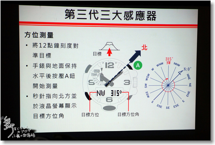 ▲接著就來說明第三代三大感應器的操作。首先是『方位測量』感應器的數位羅盤,將12點鐘的位置對準目標方位角,手錶和地面保持水平,這時按下A鈕即可測量,這時螢幕會顯示COMP字樣,再顯示目標的方位角,秒針則持續定位在正北方。