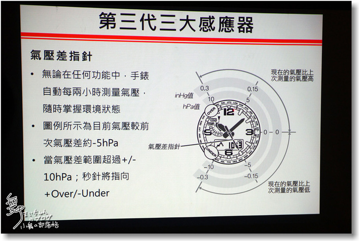 ▲而在氣壓部份有配備『氣壓差指針』,可以顯示近兩次測量氣壓的差異,從外錶盤3點鐘上有著氣壓差指針指示環,往上標註+1起一直至9到OVER,往下則是-1起至-9到UNDER,這是在測量氣壓時,秒針會指向其中一個的數字,顯示這次的測量結果比前一次測量增加或減少多少的氣壓值,如果氣壓差超過正負10hPa以上,秒針將指向OVER/UNDER。